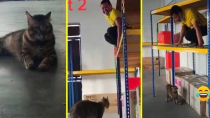 Rakaman video itu telah menunjukkan bahawa lelaki yang ket4kutan itu merangk4k dari atas rak be$i dari satu rak kepada satu rak lagi untuk melarikan diri daripada kucing yang mengikutnya dari bawah rak tersebut dan melihat kepada reaksi kucing itu, kucing itu dalam posisi untuk menyer4ng.