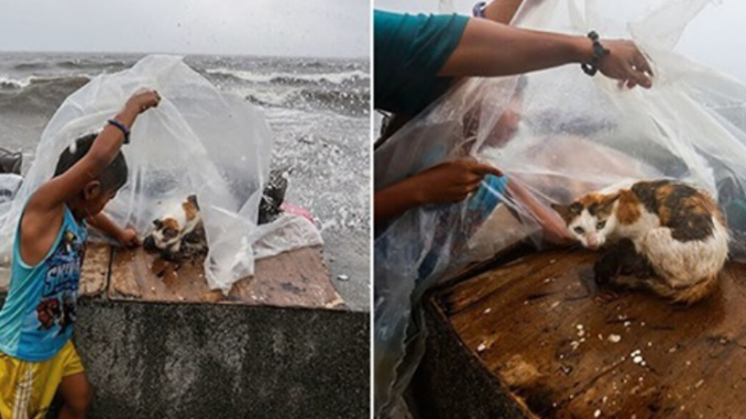 Perubahan bermusim di Teluk Manila di Filipina selalunya disertai taufan. Bagaimanapun, seorang budak lelaki masih tidak berganjak walaupun direndam dengan kulit. Dia seolah-olah tidak mengambil berat tentang keselamatannya apabila ternampak seekor induk kucing sedang bersalin dalam ribut taufan.
