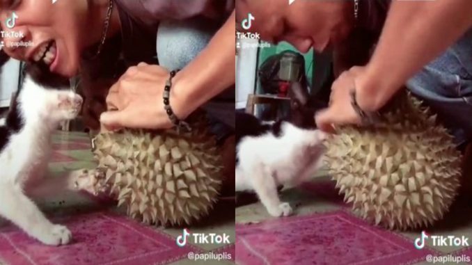 Video TikTok yang dikongsikan oleh pengguna ini menunjukkan dia sedang cuba membuka sebiji durian di hadapan dua ekor anak kucingnya.