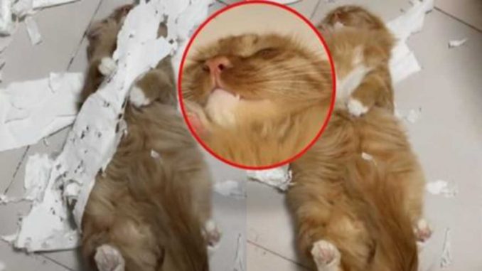 Di dalam video yang dikongsikan ini, kelihatan seekor kucing berwarna oren yang sedang terbaring dengan keadaan terlentang. Di sekelilingnya turut kelihatan beberapa tisu yang habis disepahkan di mana kebanyakannya hancur dikerjakan.