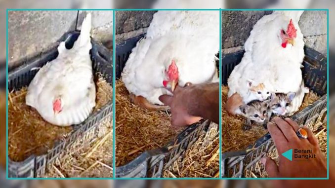 Ia disaksikan sendiri oleh seorang petani yang terkejut apabila melihat ayam betinanya menunjukkan ciri keibuan dan menjaga tiga ekor anak kucing.
