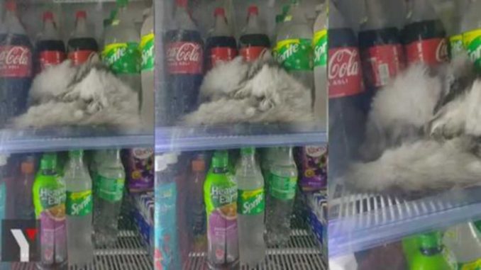 Mungkin dek kerana cuaca panas yang tidak menentu menyebabkan kucing tersebut berusaha mendapatkan keselesaan buat dirinya sendiri.Apa yang lebih menghiburkan netizen adalah apabila kucing tersebut dibiarkan tidur di dalam peti ais sambil pintu peti ais tersebut ditutup!