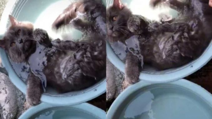 Dalam satu perkongsian tersebut kelihatan seekor si bulus santai berendam dalam air. Besen yang berisi air itu diletakkan di luar rumah dan si comel ini tenang sahaja terbaring di dalamnya.