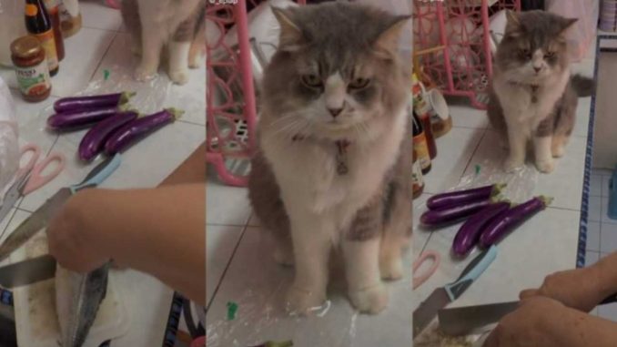 Namun lain pula dengan reaksi kucing ini yang hanya membuat muka tidak tahu sahaja semasa dirakamkan. Lebih mencuit hati, turut dapat dilihat reaksi kucing itu yang seperti malas mahu menemani pemiliknya itu di dapur.