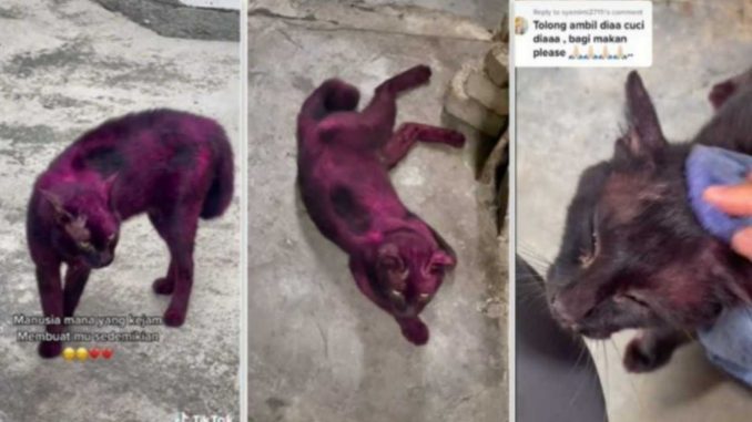 Sebuah perkongsian video telah tular apabila seekor kucing yang berwarna hitam dianiaya oleh manusia yang kej4m sehingga sanggup mewarnakan bulu kucing itu dengan spray berwarna ungu. Tetapi nasib kucing itu baik kerana berjumpa dengan seorang jejaka yang baik hati.