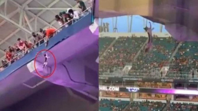 Namun tiada siapa yang tahu bagaimana seekor kucing ini boleh berakhir di sebuah stadium serbaguna di Florida apabila dia dilihat berpaut pada tingkat atas tempat duduk penonton.