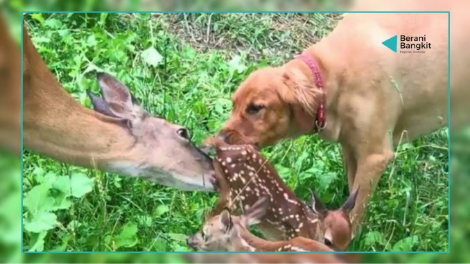 Ibu rusa membawa anak-anaknya kepada anjing sahabatnya untuk minta bantu menjaganya