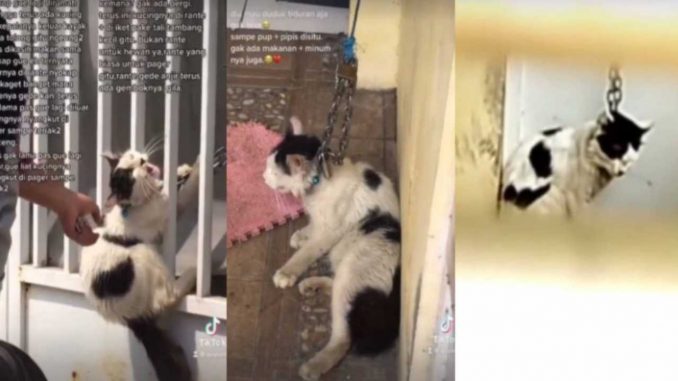 Seekor kucing berjaya diselamatkan oleh sekumpulan individu dipercayai jiran dan pihak rumah penyelamat kucing setelah mendapati haiwan itu d1ikat dengan rantai bes1 pada leherny4.