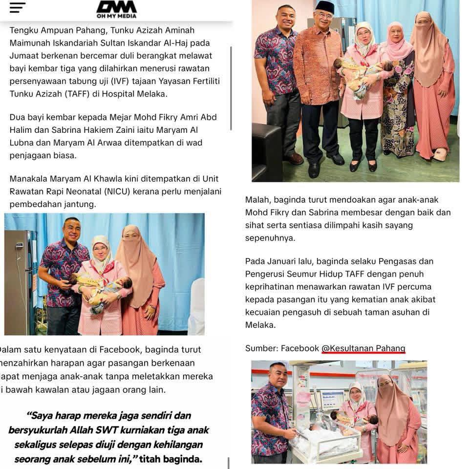 @kesultanan.pahang KDPB TENGKU AMPUAN PAHANG BERKENAN LAWAT BAYI KEMBAR TIGA DI HOSPITAL MELAKA MELAKA, 5 Disember 2025 – Kebawah Duli Paduka Baginda Tengku Ampuan Pahang Tunku Azizah Aminah Maimunah Iskandariah Binti Almarhum Sultan Iskandar Al-Haj hari ini berkenan bercemar duli berangkat melawat bayi kembar tiga yang lahir menerusi rawatan persenyawaan tabung uji (IVF) tajaan Yayasan Fertiliti Tunku Azizah (TAFF), di Hospital Melaka. Dua bayi kembar kepada Mejar Ir. Ts Mohd Fikry Amri Abd Halim dan Puan Sabrina Hakiem Zaini iaitu Maryam Al Lubna dan Maryam Al Arwaa ditempatkan di wad penjagaan biasa manakala Maryam Al Khawla kini ditempatkan di Unit Rawatan Rapi Neonatal (NICU) kerana perlu menjalani pembedahan jantung. Keberangkatan tiba Paduka Baginda di Hospital Melaka pada pukul 9.45 pagi disambut Yang Dipertua Negeri Melaka, Tuan Yang Terutama Tun Seri Setia Dr. Haji Ali bin Mohd Rustam serta isteri, Yang Amat Berbahagia Toh Puan Datuk Wira (Dr) Hajah Asmah Binti Abdul Rahman. Paduka Baginda kelihatan begitu ceria meluangkan masa kira-kira 45 minit bertemu ketiga-tiga bayi berkenaan yang merupakan bayi ke-145, 146 dan 147 yang dilahirkan sejak TAFF ditubuhkan pada 2004. Paduka Baginda turut menzahirkan harapan agar ibu bapa bayi kembar tiga ini agar menjaga anak-anak ini sendiri tanpa meletakkan mereka di bawah kawalan atau jagaan orang lain. “Saya harap mereka jaga sendiri dan bersyukurlah Allah SWT kurniakan tiga anak sekaligus selepas diuji dengan kehilangan seorang anak sebelum ini,” titah baginda. Paduka Baginda turut mendoakan agar ketiga-ketiga bayi ini membesar dengan baik dan sihat serta sentiasa dilimpahi kasih sayang sepenuhnya. Pada Januari lalu, Paduka Baginda selaku Pengasas dan Pengerusi Seumur Hidup TAFF dengan penuh keprihatinan menawarkan rawatan IVF percuma kepada pasangan ini yang kematian anak akibat kecuaian pengasuh di sebuah taman asuhan di Melaka. Tragedi berkenaan turut menarik perhatian dan simpati rakyat Malaysia terhadap pasangan ini yang kehilangan anak lelaki berusia lapan bulan selepas berusaha dan menanti cahaya mata selama 13 tahun. Untuk rekod, TAFF yang ditubuhkan atas inisiatif KDPB Tengku Ampuan Pahang sejak 21 tahun lalu telah menaja 553 pasangan suami isteri seluruh negara yang menghadapi kesukaran untuk mendapatkan cahayamata.-KESULTANAN PAHANG #bayikembar #tahniah #tengkuampuanpahang #taff ♬ original sound – Kesultanan Pahang