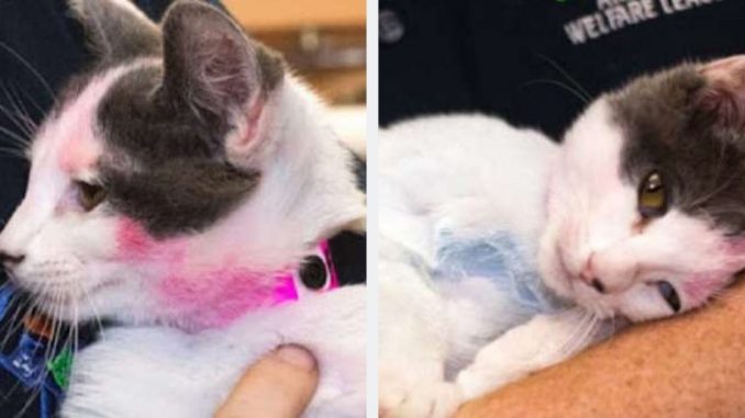 Oleh itu, apabila seekor kucing Tuxedo muda ditemui dibuang di depan pintu perlindungan haiwan di Arizona dengan bulu merah dan biru, penyelamat tahu masa lalunya tidak baik.