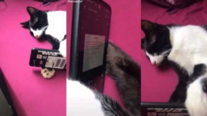 Pada gambar dan video yang dikongsikan ini, kelihatan seekor kucing yang sedang nyenyak tidur di atas sebuah katil semasa dirakamkan. Dalam masa yang sama, turut kelihatan sebuah telefon yang dipegang oleh kucing itu yang masih lagi tidur.