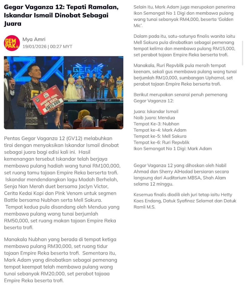 @kamarulzaidi_ Korang setuju dgn Juara GV12 ? Tahniah Abg Eiss. Konsert Akhir. Gegar Vaganza 12 – Akhir. Saksikan bintang bintang beraksi Setiap Ahad jam 9 malam di Astro Ria, Sooka & Astro One #CelcomDigiGV12 #GV12 #SemangatNo1 #Vaganzers #SembangEntertainment @ISKANDAR ISMAIL @CelcomDigi @Astro Malaysia @sooka malaysia @sherry_alhadad @Nabilahmad @thehettykoesendang @ropie_sryn13579 ♬ original sound – Kamarulzaidi Zaini