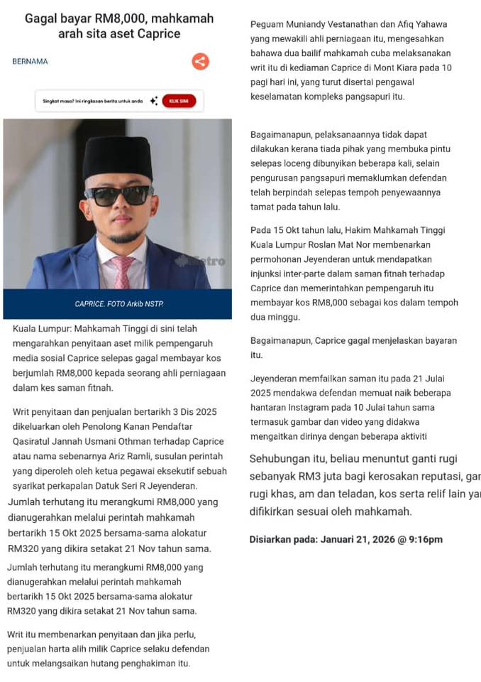 “fuhh.. bnyknya Caprice tak byar duit org..”- Sah mhkamah sita harta. ini jumlah hutang Caprice & senarai brang2 yg disita.. January 21, 2026 admin Uncategorized 0 Artikal popular :