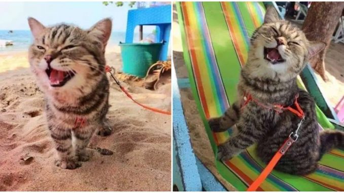 Kucing kecil yang teruja pada mulanya boleh dilihat secara ingin tahu meninjau persekitarannya dengan kakinya menggali ke dalam pasir. Kucing comel itu kemudiannya memancarkan senyuman lebar pada kamera untuk berkongsi kegembiraannya kerana dapat merasai pengalaman di pantai buat kali pertama.