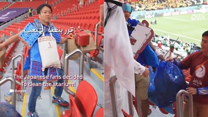 Videonya berdurasi kurang dari seminit tersebut menunjukkan penyokong pasukan Jepun membawa plastik sampah dan membantu untuk membersihkan kawasan stadium selepas kebanyakan penyokong lain keluar sesudah tamat perlawanan.