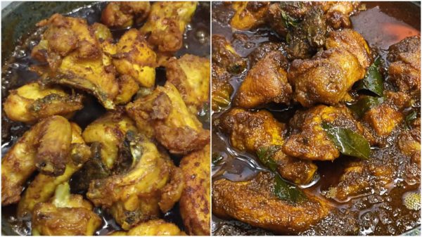 1. Gaul dahulu ayam dengan serbuk kunyit dan garam. Goreng ayam setengah masak dan ketepikan seketika. Panaskan minyak dan tumis bawang besar, bawang putih, dan halia sampai naik bau.