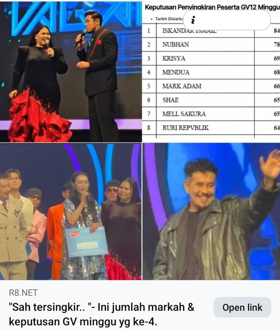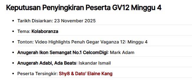 @f8buzz Markah penuh dan keputusan minggu keempat Gegar Vaganza 12 🔥🔥🔥 Shy8 dan Dato’ Elaine Kang tersingkir minggu ini. 🎤✨ Gegar Vaganza 12 kembali! Saksikan 13 bintang hebat berentap: Dato’ Elaine Kang, Krisya, Mell Sakura, Korie, Rahmat Ekamatra, Mark Adam, Nubhan, duo Freshies (Ejie & Shima), Shae, Ruri Repvblik, trio Mendua (Pungky, Sasha & Diana), Iskandar Ismail serta SHY8 (Wildcard). 📅 Setiap Ahad