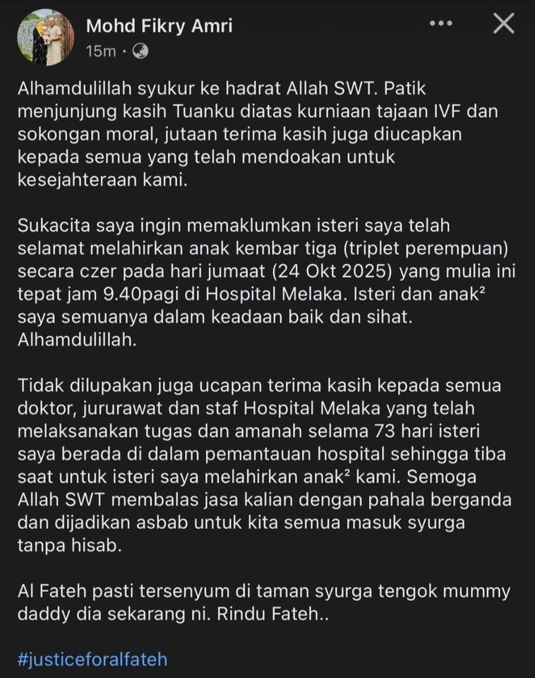 Siapa ingat kisah adik Al Fateh yg mninggal akibat kecuaian taska tahun 2024? Lepas setahun Allah kurniakan rezeki buat Ibubapa arwah anak Kembar tiga skali.. Ini wajah & jantina bayi..