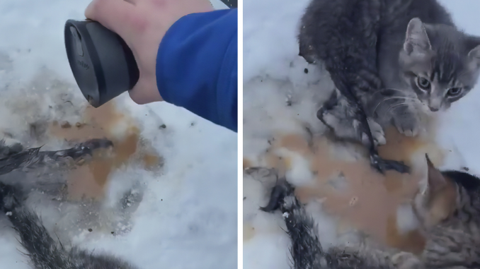 Lelaki itu tidak teragak-agak dan melompat semula ke kereta untuk mengambil satu-satunya benda cair yang ada padanya—kopi suam. Selepas kembali kepada haiwan yang ditinggalkan, dia mula menuangkan apa-apa baki kopi yang ada pada ekornya. Terkejut lelaki itu, anak kucing comel itu secara naluri mula meminumnya, tetapi tidak cukup untuk memberi sebarang kesan negatif.