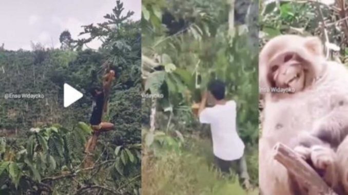 Apa yang lebih mencuri perhatian ramai adalah apabila pemuda yang memanj4t pokok itu akhirnya terj4tuh dan digelakkan oleh seekor monyet. Gaya ketawa haiwan itu pun bukan main lagi! Berikut adalah perkongsian rakaman pemuda panjat pokok terjatuh ini